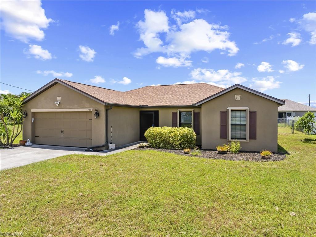 ***ASSUMABLE 2.625% MORTGAGE!!*** Welcome to this beautifully maintained 3-bedroom, 2-bathroom home in Cape Coral offering 1,522 square feet of comfortable, one-story living—with no HOA and no flood zone concerns. Significant updates have already been done for you: a new roof (2024), new water heater, new refrigerator, new microwave, and accordion storm shutters installed in 2022 on every window and around the lanai. These shutters provide strong, reliable protection during storms, are easy to operate, and add peace of mind without the hassle of traditional panels. The home features a bright, open layout that creates a warm and inviting atmosphere. The eat-in kitchen is ideal for cooking and gathering, offering a center island, breakfast bar, new appliances, and ample storage. The dining area flows seamlessly into the spacious living room, which has been freshly painted and is perfect for both relaxing and entertaining. Enjoy the outdoors from the screened-in front porch, offering a charming and shaded welcome to guests. A split bedroom layout ensures privacy, with the primary suite separated from the two additional bedrooms. The primary suite includes a walk-in closet and a private ensuite with a walk-in shower. The secondary bedrooms share a full bathroom. Additional conveniences include an in-house laundry room with washer and dryer, sliding glass doors leading to a covered lanai, and a fully fenced backyard. The lanai is protected by the same accordion shutters, providing extra shelter during severe weather. A sprinkler system in both the front and back yards helps keep your landscaping green and healthy. The 2-car attached garage adds even more functionality and storage. Situated on a street that remains elevated and dry even during heavy rains, this home offers long-term confidence and comfort. With easy access to shopping, dining, and schools, this move-in-ready home checks every box in a desirable Cape Coral location.