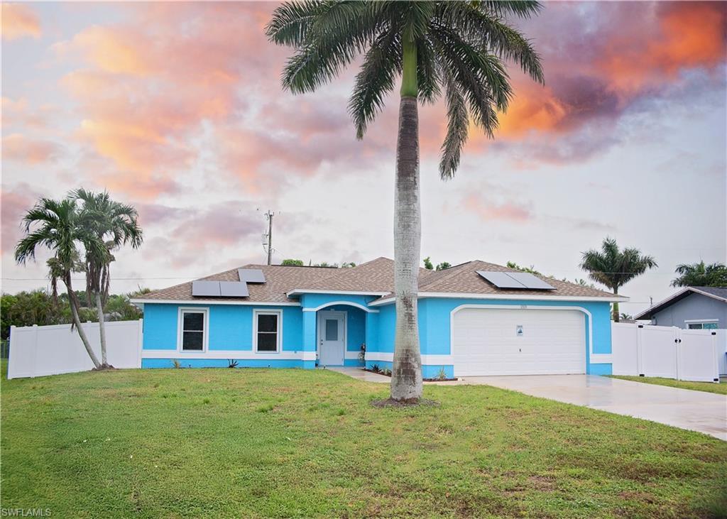 HOT PROPERTY~~!! SOLAR PANELS (PAID)~~!! CITY WATER AND SEWER IN AND PAID~~!! NOT IN A FLOOD ZONE~~!! HURRICANE IMPACT WINDOWS & DOORS~~!! BRAND-NEW HEAVY-DUTY PRIVACY FENCE (2025) ~~!! Professional exterior paint (2025) These are just some of the improvements made to this Beautiful 3/2/2 in a Prime Cape Coral Location – Move-In Ready! Step inside through the foyer to a bright open-concept layout with a split-bedroom floor plan—perfect for both entertaining and privacy. The kitchen flows seamlessly into the living and dining areas, while hurricane-impact sliding glass doors lead to a covered, screened-in patio. Relax with your morning coffee while overlooking the spacious, fully fenced backyard—plenty of room for a pool, pets, and play. The dual-opening fence gates provide easy access for your boat or RV. Located in one of Cape Coral’s most desirable neighborhoods, you’ll be close to parks, shopping, dining, nature trails, water access for boating and fishing, and top-rated schools. Quick access to both bridges makes getting to Fort Myers & beaches, fast and convenient. Don’t miss this opportunity to own a truly move-in ready home in a sought-after location—schedule your private showing today!