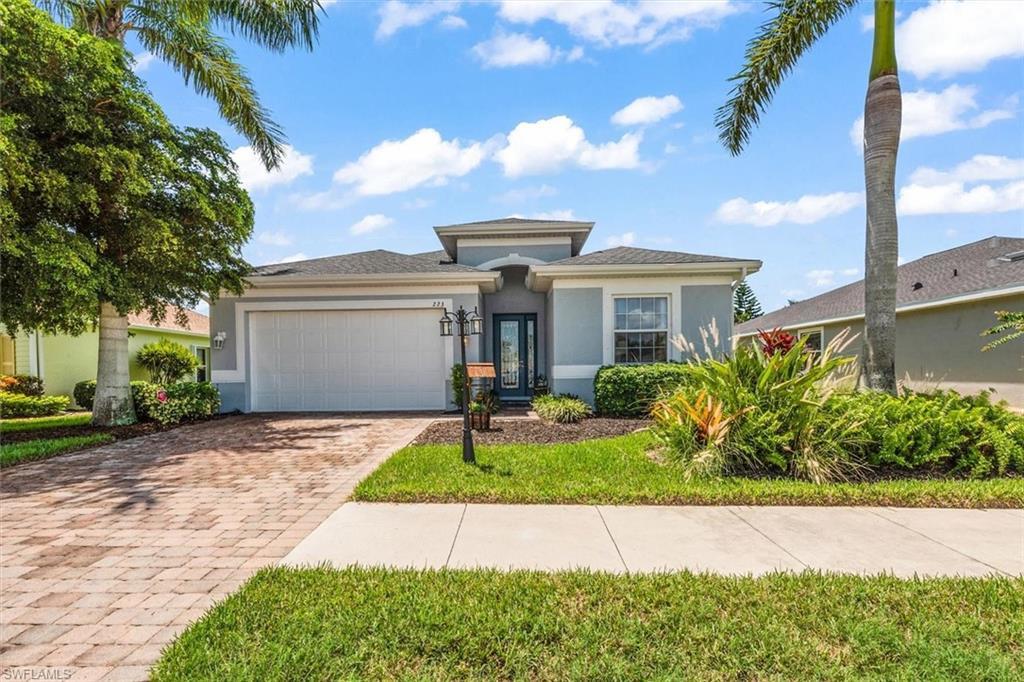Beautifully updated and maintained 2433 square foot home in the desirable gated community of CELEBRATION CAPE. Built in 2015, the home boasts 4 bedrooms, 3.5 bath, great room floor plan. large screened lanai and the south facing lot backs up to a privacy wall. Home is extensively upgraded with NEW ROOF (2024), New Samsung Kitchen appliance package (2020), all new window treatments (2024), PLUS crown molding in all living areas and tray ceilings. No carpet - tiled floors throughout the living areas and high end laminate wood floors in 3 of the the bedrooms. The kitchen has a custom backsplash that accentuates the 42 inch cherry cabinets with soft close doors and drawers, granite counter tops, walk-in pantry and stainless steel appliances. All of the baths feature granite counter tops and in the large master bath you can relax in the jucuzzi tub. Washer/Dryer is 4 years old and the laundry room has lots of storage and a sink/laundry tub! Portable generator is included as well. Low monthly fees of $271/ month include iawn maintenance (mowing, trimming, fertilizing), exterior pest control, irrigation water, and repairs, and upkeep on all common property. Front plant beds have recently been refreshed. This beautiful hidden community has sidewalks on both sides of the street, underground utilities, a dog park and a community pavilion on the lake. Located in the heart of Cape Coral and with quick access to restaurants, shopping, golf courses and Sunsplash Waterpark. NOT IN A FLOOD ZONE and only 57 homesites!