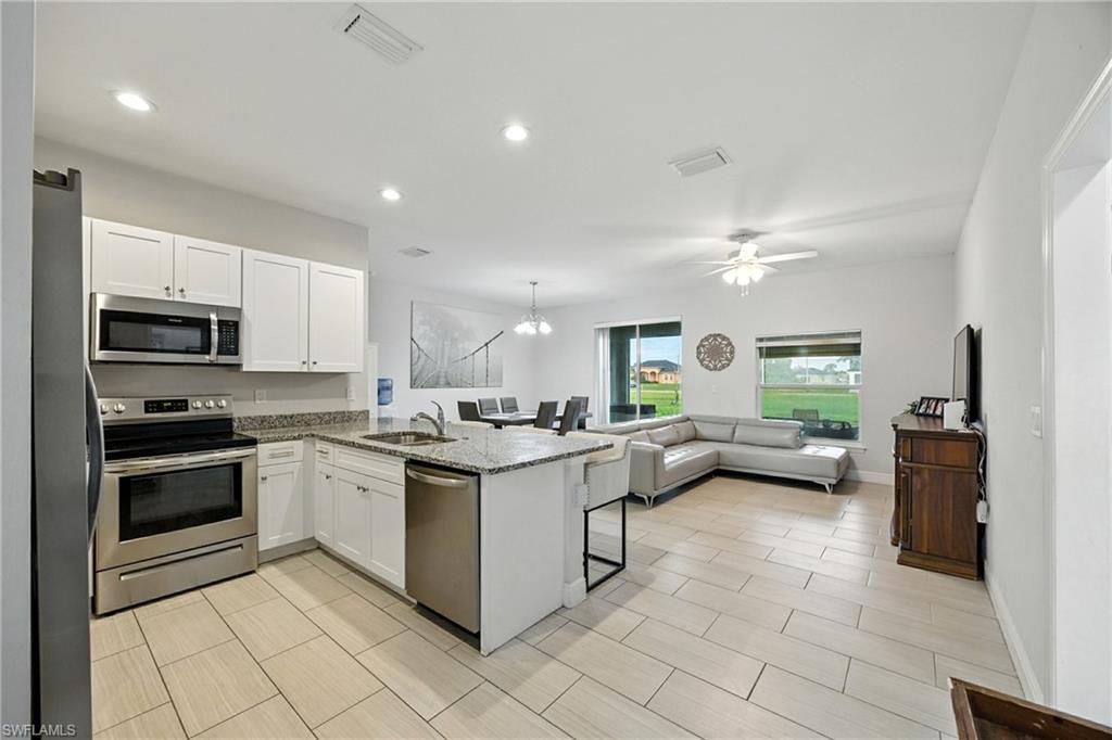Nestled in the rapidly expanding Northwest Cape Coral area, this charming, meticulously maintained 2022 home offers a perfect blend of comfort and functionality. The residence boasts an open-concept, split floor plan spanning 1,688 square feet, including three bedrooms, 2 bathrooms and a versatile den. The chef's dream kitchen is an entertainer's delight, featuring a spacious breakfast bar, white shaker style cabinetry, elegant granite countertops, recessed lighting, and stainless steel appliances. Hurricane shutters on all windows and doors provide added peace of mind and contribute to lower homeowner's insurance costs.  Step inside to discover beautiful tile flooring that flows throughout the entire home, complemented by high ceilings and blinds on all windows. The private primary suite is a true retreat, offering two walk-in closets and a luxurious en-suite bathroom with separate his-and-hers vanities and an oversized, glass-enclosed walk-in shower. On the opposite side of the home, the two guest bedrooms and a full guest bath ensure privacy for family and visitors, while the den, located off the foyer, is perfect for a home office or extra living space.  Experience the best of Florida's weather from your screened-in lanai, accessible via sliding glass doors. A jacuzzi, also available for purchase, provides the perfect spot for unwinding.  This property operates on a well and septic system, which helps save on utility costs. Drive up to this beautiful concrete block home featuring a brick paver driveway and a 2 car garage where the breaker panel has a 220 outlet for a generator. The spacious laundry room includes a washer, dryer, and a laundry sink.  With no HOA, CDD fees, or rental restrictions, this is an excellent investment opportunity that grants you the freedom to make it truly your own. Its prime location off Burnt Store Rd near Diplomat Pkwy provides easy access to an abundance of shopping, dining, entertainment, top schools, golf courses, marinas, and the gorgeous beaches of Southwest Florida. You'll also enjoy convenient proximity to RSW and Punta Gorda airports. Stop paying rent and start investing in your family’s future—call today to schedule your private showing.
