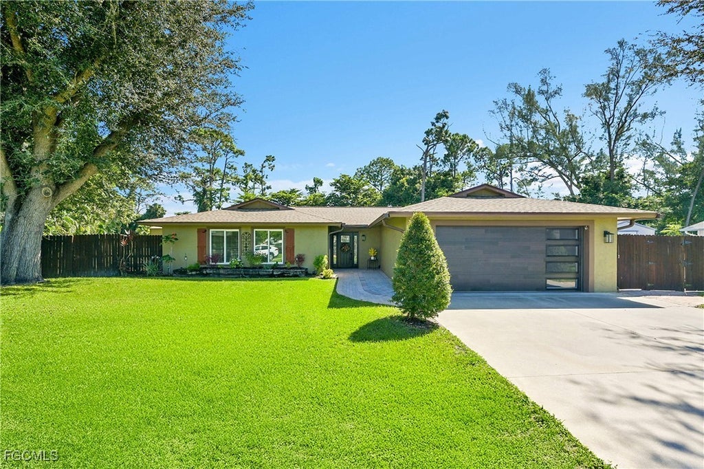 Welcome to Camelot! This 3-bedroom, 2-bath pool home sits on a little over 1/2 acre (.60 acres to be exact) in a quiet, private community. Step inside and discover a bright living area with a shiplap accent wall and a stunning chandelier that adds a touch of elegance. The kitchen boasts stainless steel appliances, granite countertops, a tasteful backsplash, and plenty of storage. Each bedroom is generously sized with ample closet space. The primary bedroom features stylish barn doors leading to the en-suite bathroom. Step outside and be transported to the true Florida lifestyle! Featuring a large, fully fenced-in backyard with a pool, the patio is ideal for entertaining or just relaxing in the Florida sun. Enjoy plenty of space and privacy! The side yard offers secure storage for an RV or boat, tucked inside the fenced yard. You’ll love the garage, which could also be called the "man cave"! It offers lots of storage space, a wood accent ceiling, a mini-split A/C, and an insulated garage door. Recent upgrades include a new roof in 2024, new gutters, and impact windows throughout. This home has it all! NO HOA FEES! FLOOD ZONE X – No flood insurance required. The community is tucked away in a nice private area located in the heart of the Daniels corridor in Fort Myers, making it the perfect escape from the hustle and bustle while keeping you centrally located just minutes from dining, shopping, and entertainment. It's just 1 mile from Whole Foods, Gulf Coast Hospital, and so much more. You're also just 5 minutes from Hammond Stadium, 10 minutes from JetBlue Park, 15 minutes from RSW International Airport, and a short 20-minute drive to the beautiful Fort Myers Beach! This home won’t last long!