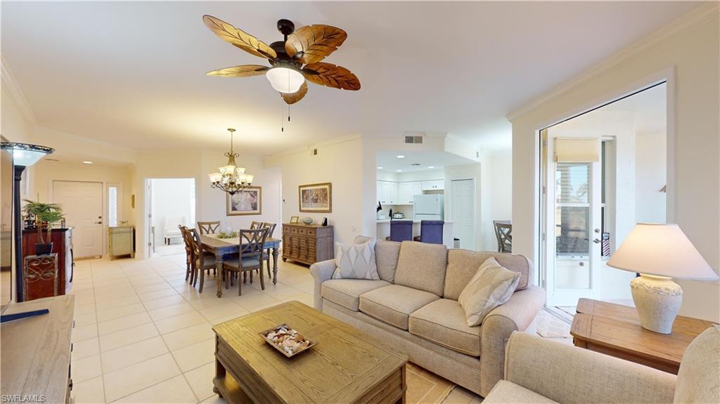 This fully furnished (with exceptions) and beautifully maintained first floor 3 bedroom 2 bath "Nottingham" carriage home is located just minutes from Sanibel and Ft Myers Beach in the Lexington Country Club "Golf Village." You'll find 20" porcelain tiles throughout the this carriage home with new furniture, lighting, cabinets, and appliances, including the washer and dryer. The AC handler & condenser were new in June 2020; water heater new in 2019. Hurricane panels on many windows. The large lanai allows you to look out to a beautiful view of water on hole 12. A new Club Car golf cart is being sold separately. The Lexington community offers all the features of an active lifestyle with the 18-hole championship golf course, 12 lighted tennis courts with designated pickleball courts, 6 heated swimming pools, a fitness center with onsite group classes, lending library, tiki bar/restaurant, beach area, clubhouse restaurant, 3 bocce courts; onsite coffee shop. You will be wowed by the beautifully maintained grounds and appreciate the onsite 24 hr security. The community also offers special events like Music Monday at the Island Club, Bingo at the Clubhouse and an abundance of clubs to join depending on your interests. Offered furnished so you can move right in and start enjoying the fabulous Lexington lifestyle! Just minutes from the beaches, RSW Airport, shopping, dining, and hospitals. Don’t forget to look at the virtual tour--either play it or click to walk-through each room.