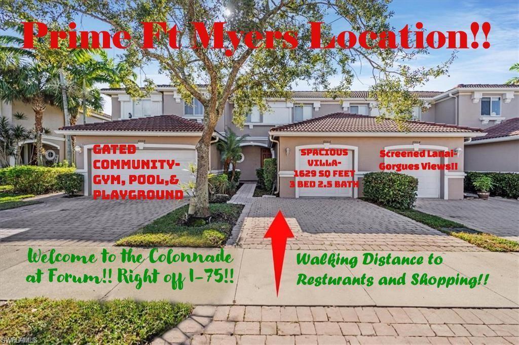 Your Dream Villa Awaits in The Colonnade at Forum! Welcome to this stunning 3-bedroom, 2.5-bathroom villa in the heart of Fort Myers, offering the perfect blend of modern style and convenience. This two-story townhome is an ideal retreat for families and guests. Step inside and be greeted by a beautifully updated interior. The spacious kitchen is a chef's delight, featuring sleek granite countertops and stainless steel appliances. The home boasts a sophisticated combination of carpet and tile flooring, adding a touch of elegance to every room. The updated master bathroom offers a luxurious, spa-like experience. Relax and unwind in your private, screened lanai, the perfect spot to enjoy the beautiful Florida weather year-round. You'll also have a secure one-car garage for your vehicle. As a resident of the prestigious Colonnade at Forum community, you'll have access to fantastic amenities, including a community pool and a fitness center. The neighborhood provides a peaceful environment while being just minutes away from all that Fort Myers has to offer. Its prime location offers easy access to I-75, shopping malls, restaurants, beaches, universities, and the airport. This villa with its impeccable features and prime location is the perfect place to call home. Don't miss out on this opportunity—schedule your showing today!