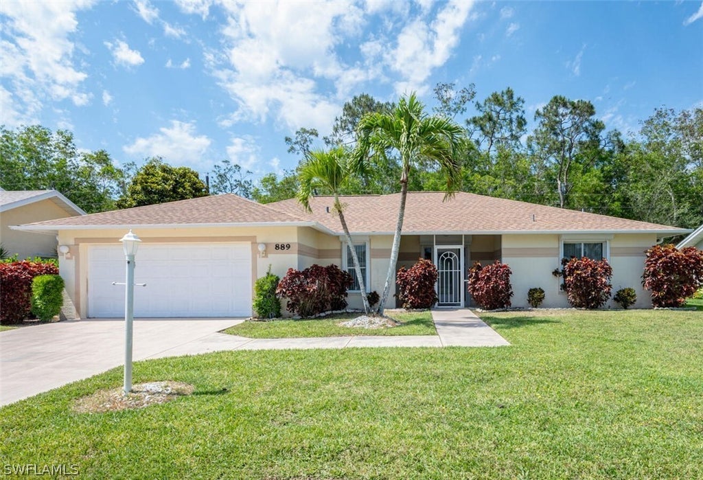 This large 2BR/2BA home has 1,784 S/F under air, a big jump in size from most two bedroom single family homes on the market in Naples. It was built in 1996, one of the newer homes in Riviera Golf Estates (a 55+ community eight miles from the beach). The seller just put on a brand new roof, had the plumbing redone, and the interior is freshly painted. Vaulted ceilings with crown molding and tile flooring on the diagonal in all but the guest bedroom add to the home's spacious feel. The kitchen features granite counters and a new stainless steel refrigerator. There are dual walk-in closets in the Master BR, one with a closet organizer system, and dual sinks in the Master BA. The laundry room has a stationary tub and extra storage space. The home is being sold partially furnished and is move-in ready. For $144/mo. (includes your basic internet), the community also features excellent amenities: a new saltwater pool with lap lanes, tennis/pickleball/bocce courts, an exercise room, billiards room, clubhouse with active social calendar, etc. Best of all, it is only a few miles from downtown Naples, great beaches and amazing shopping and dining options. So if you’re looking for room to stretch your legs, without breaking the bank, come check out 889 Charlemagne!