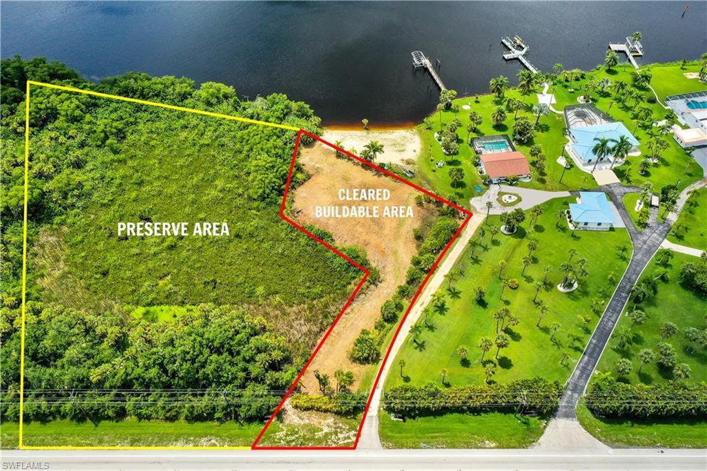 RIVERFRONT OPPORTUNITY! Very rare property with tons of potential on 3 acres - Red outline is 1.46 acres that has been prepped for building and the plans have been approved by Fort Myers & the yellow outline is the additional 1.4 acres. This property is located off the Caloosahatchee River in SWFL -highly desired due to offering a peaceful waterfront setting while being an intercostal waterway, plus you will have quick access via boat to the Gulf of Mexico. Build the home of your dreams and the permit has been approved for the possible plans for home and driveway.