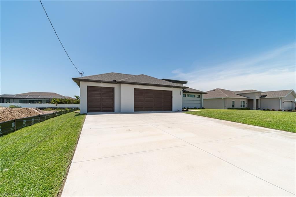 Newer home. 3 beds, 3.5 baths, and a 3-car garage. High 12' flat ceiling. Just 1 mile from Coral Oaks Golf Course, a few minutes' drive to Burnt Store Rd Boat Ramp, and close to Seven Islands Project. The growing area in Cape Coral. This spacious residence offers an open floor plan with split bedrooms. With a total area of over 3,100 square feet, it features a large great room, a master bath with double sinks and a separate shower and tub, and a laundry room in residence with a utility tub. The open layout makes it perfect for entertainment. The half-guest bathroom is in the backyard, just add a pool. This extraordinary home won't be available for long. This tropical gem has no HOA. Act now, don't miss your chance to own a slice of Paradise and its year-round great weather in one of SW Florida's most desirable locations. Pictures shown are from before the house was occupied and right after it was built, so no furniture is shown in the pictures, but there will be furniture in the house when you visit.