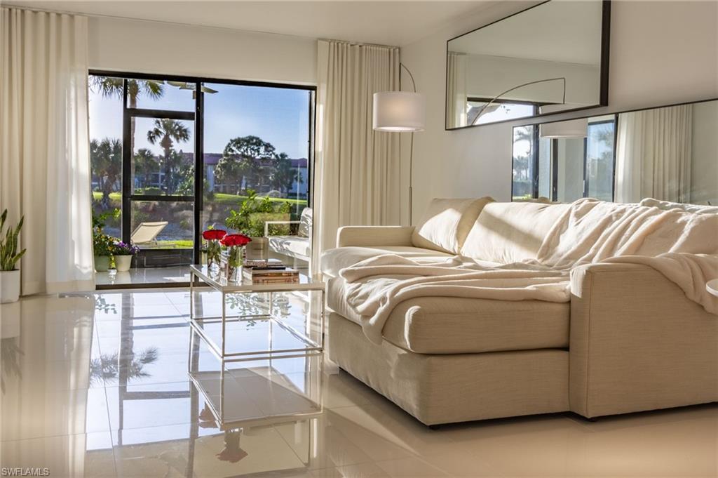 Gorgeous modern brand new fully remodeled condo, 2 miles from beach, facing west and the most beautiful daily sunsets! Building is 9 ft above sea level. Structural Integrity Inspection completed. Reserves fully funded. No Assessments. Located inside a private gated community with 18 hole golf course, clay tennis courts, newly remodeled private clubhouse with an amazing bar & restaurant. Condo remodeled with Aroma360 HVAC Scenting System, Trane XR-15 two ton Air Conditioner with REME Halo Anti-microbial UV Light & Linear Diffuser Vents, Samsung Stainless Steel Appliances, modern frameless Thin Shaker Kitchen Cabinets with grey Quartz countertops, LED recessed ceiling lights & Lutron Lighting Dimmer Switches throughout, Deep Soak Bathtub in Guest Bathroom, Kohler & Moen Kitchen/Bath Fixtures, Large Format High Gloss Porcelain Tile floors in a creamy Sand color installed with 1/32 sealed grout for a natural marble look, new remote control electric roll down Hurricane Shutters on all windows and doors, Custom California Closets, 87 inch wall mounted QLED Google Smart TV in Living Room, 60 inch wall mounted QLED Smart TVs in both bedrooms, custom made Ripple Fold drapery from "The Shade Store Naples" on all windows, brand new cellular/not wifi ADT Security & Fire Alarm System with 24 hour battery backup. All furniture & fixtures included in listing price.