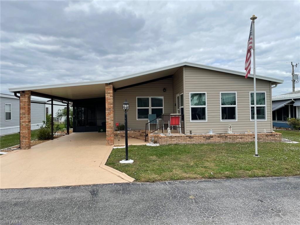 Carefree living at its finest! Beautifully maintained Great room unit with cathedral ceilings. New Sunroom for you to enjoy coffee or a great game of cards with friends. Prefer to hang outside? Enjoy the wonderfully inviting screened room or the open front porch to enjoy watching your neighbors bike by. LOTS of extra cabinets and smooth top counters in this kitchen - perfect for a buffet meal or those extra appliances for special occasions. Then of course you can eat inside at the kitchen nook or take your meal out to enjoy the weather. Main suite has cathedral ceilings and the main bath has a LOT of light (skylights NEW 1/26/25) and tall updated counters with 2 sinks. For the handy man/woman, let them know that there is a workshop just for them! There is electric, available storage and an in wall a/c unit to use. Know that your car is shaded from the elements with the carport and decorative brick siding. Vinyl and tile flooring, plant shelves. LOTS of updates! 2023 - New tie downs in front and rear. A/C - 2019 (with an annual service contract in place) They have pest service in place with a yearly contract as well (transferable) Kitchen & laundry redone in 2018. 2019 Screen room installed, 2020 - Main bedroom remodeled. 2021 New wood blinds in all windows, 2023 New shingle roof installed - 2024 new sun room, new siding on 3 sides and 13 NEW WINDOWS. Partially furnished. This is a 55+ community with an active group of people. Three pools and fantastic access to all that the area has to offer! Such a quaint community and close to shopping, restaurants, entertainment and main roads. Flood insurance not required (at this time) in this area of the park.