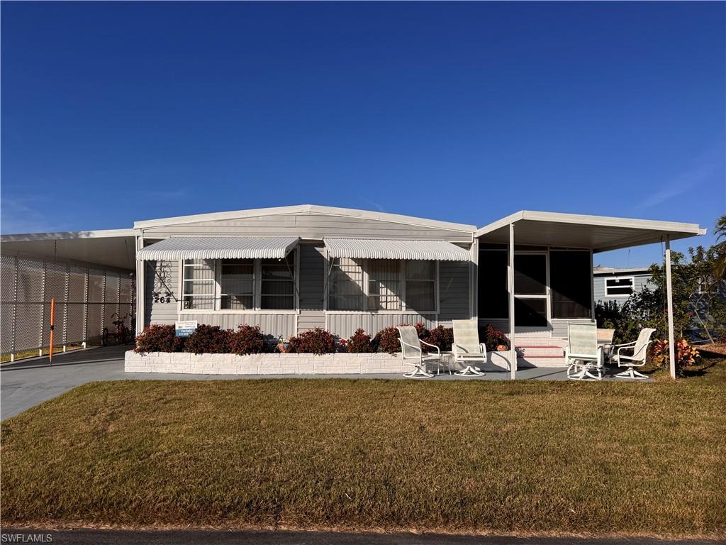 Price Reduced! All Offers Will be Reviewed! This 1,260 sq ft. 2 bed/2 bath home offers comfortable spacious living, inside and out. Move in ready with so many special features to include an eat-in kitchen with lots of cupboard space, walk-in showers in both bathrooms, the guest bedroom is large and has ample closet space. The large master features a walk-in closet, on-suite bath and access to the outside backyard deck. There’s an enclosed porch adjacent to the living room and lots of outside seating. The washer and dryer and workshop are in the shed. The home sits on a corner lot with a big side yard along with a large common area behind the home. It’s time to relax and enjoy the amenities of the 55+ waterfront community of Orange Harbor with its two boat ramps, boat storage, fishing pier and lots of amenities to include a clubhouse, heated pool and two new pickleball courts. The monthly maintenance fee is $406 which includes water/sewer, trash removal, lawn care, and fiber optic internet. Orange Harbor is a pet friendly community close to downtown Fort Myers, the Manatee Park, shopping and restaurants. Two pets per household, with some dog breeds prohibited, so be sure to review the rules, ESA animals are allowed. Price includes the share for the lot and ownership in the community.