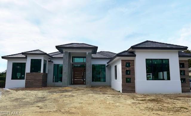 NEW CONSTRUCTION -View of Water- GOLF!!! Indulge your senses with this exceptional Estate Home in its final stage of construction to be FULLY FURNISHED. This distinctive Waterfront property has gorgeous Southwestern sunset views and an inviting outdoor lanai with a creative pool/spa design for a fabulous retreat. Attention Golfers: paradise awaits....this property INCLUDES A GOLF and SOCIAL MEMBERSHIP at Quail West Golf and Country Club. This property is meticulously designed with a Modern Coastal atmosphere and exceptional luxury details throughout. Includes premium finishes of large format porcelain accent walls, unique premium glass modern cabinetry, premium signature quartzite countertops, modern appliances, creative flooring, premium light fixtures and accent illumination making this a truly dramatic home to enjoy for relaxing or entertaining. High ceilings of 12-19 ft throughout with floor to ceiling windows accentuating views from the front and rear elevations. The oversized garage will accommodate four vehicles plus a golf cart and storage area. Interior photos represent similar finishes and design style.