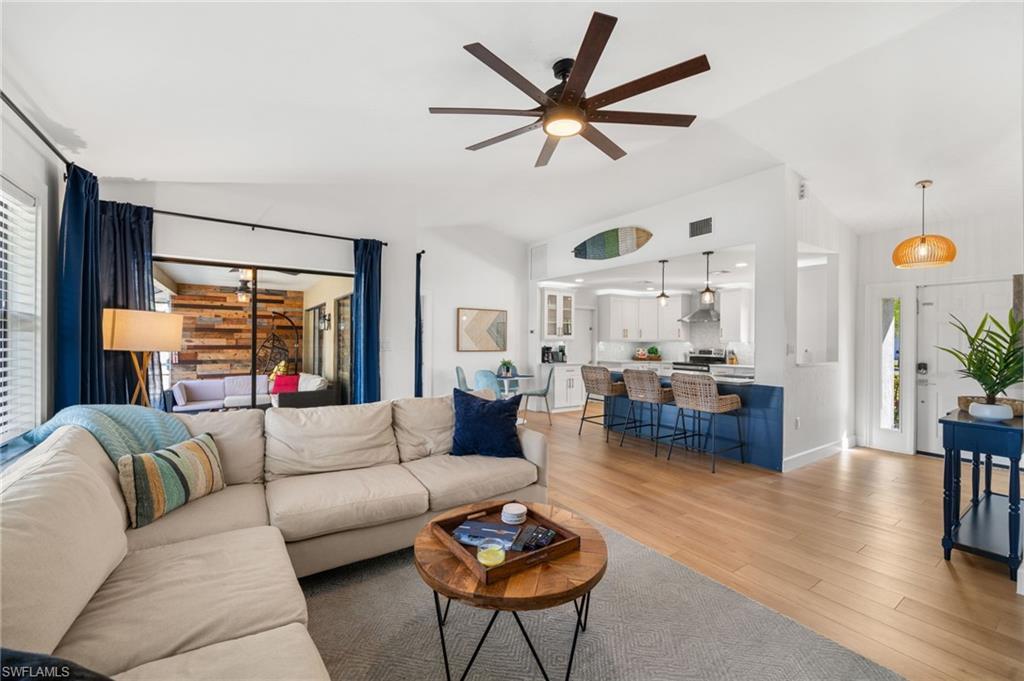 Light and bright 3 bedroom, 2 bathroom home with pool in the sought-after community of River Reach! This stunning, fully renovated 3-bedroom, 2-bathroom single-family home with a 2-car garage offers the perfect blend of modern elegance and Old Florida lifestyle. Situated on a spacious 0.22-acre lot, this concrete block-built home was masterfully redesigned in 2023 with top-quality craftsmanship and attention to detail. Step inside and be greeted by soaring vaulted ceilings that enhance the open floor plan, filling the home with natural light. The thoughtfully designed split layout offers privacy and functionality, making it perfect for families or guests. The main living area flows seamlessly to the covered lanai and screened-in pool area through sliding glass doors, creating an ideal indoor-outdoor living space. The large master suite is a retreat of its own, featuring a huge walk-in closet and a redesigned ensuite bathroom with a frameless glass shower and a marble-top custom vanity. Two additional guest bedrooms share use of an updated bathroom with a combination shower & tub, providing ample space for relaxation or home guest's use. The screened-in pool and spa, resurfaced in 2023, are complemented by a new electric heater, ensuring year-round enjoyment. The expansive deck and covered lanai provide the perfect setting for entertaining, lounging, or outdoor dining. The fully fenced backyard offers privacy and versatility, with a generous side yard for storing a trailered boat or RV—an uncommon and valuable feature in Naples. This home is not just a personal oasis but also a fantastic investment opportunity. Rarely found in Naples, short-term rentals are allowed in River Reach. The property is already optimized as a high-performing rental, boasting nearly 40 five-star reviews and a strong history of top-dollar bookings. Whether you’re a part-time resident or an investor, this home offers incredible income potential while maintaining your own slice of paradise. River Reach is a low-fee community with an annual HOA of only $520. Residents also have the optional privilege of joining nearby Coconut River Estates, granting access to a private boat ramp, community pool, and playground. The location is unbeatable—just minutes from downtown Naples’ historic dining and shopping, pristine Gulf beaches, and navigable boat access points. For those seeking a turnkey option, this home is available with negotiable designer furnishings from Robb & Stucky, Pottery Barn, Ballard Designs, and more, adding a layer of convenience and style to your move-in experience. This beautifully renovated home offers an unparalleled combination of modern luxury, investment potential, and prime Naples location. Whether you’re looking for a full-time residence, a vacation home, or a high-performing rental property, this gem in River Reach checks all the boxes. Schedule your private showing today!