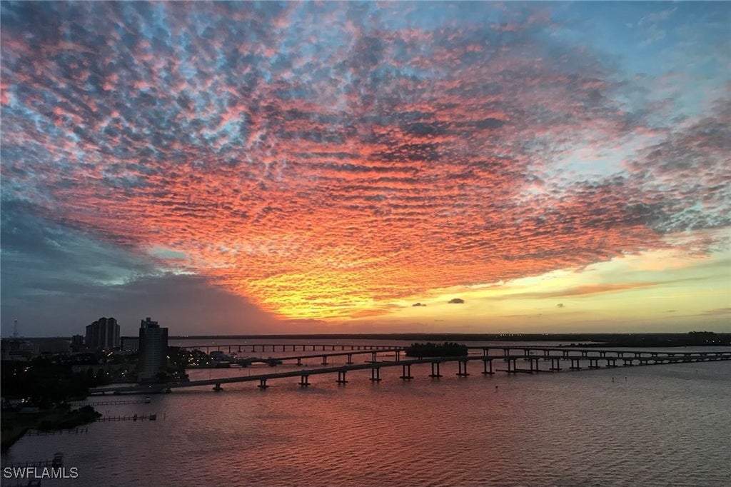 LIMITED TIME SHORT TERM PRICE REDUCTION...price reduced to $399,900 until October 1, 2025!!! With unobstructed long water views of the Caloosahatchee River, downtown Fort Myers and Cape Coral you will enjoy sensational Florida sunsets year-round. This beautiful unit provides you the luxury living you've been dreaming of...a Private elevator brings you directly from your secured garage to your gorgeous unit. This condo stands out with superior construction and high-quality upgrades...featuring updated lighting, elegant granite countertops, sophisticated tray ceilings, and a spacious open layout. The primary bedroom suite is a tranquil retreat, offering direct access to the lanai with picturesque water views. It features two spacious walk-in closets and a luxurious en-suite bath complete with a soaking tub, walk-in shower, and dual sinks. Discover the ultimate urban lifestyle in this stunning condo, situated within a prestigious community that offers unparalleled resort-style amenities. Imagine starting your day with a workout in the state-of-the-art fitness center or a refreshing swim in the heated infinity-edge pool, all while taking in panoramic views of the river and downtown Fort Myers skyline. Unwind after work in the spa or challenge friends to a game of tennis or pickleball. This vibrant community thrives on social interactions, particularly with its lively and enthusiastic pickleball groups. The community also features a chic party room, a cozy theater for movie nights, and a library for quiet moments. With secure bike and kayak storage, a kayak launch, air-conditioned storage units, and conference rooms, this property caters to your active lifestyle and professional needs. Embrace the perfect blend of work, play, and relaxation in this dynamic community. Enjoy unparalleled convenience with complimentary trolley service to downtown and Publix from November 15th to May 15th. This service provides easy access to the Historic River District, art center, riverfront amphitheater, music walk, art walk, a variety of dining options, and shopping venues. Please refer to the attached features list that describes upgrades and furnishings included along with the items that do not convey.