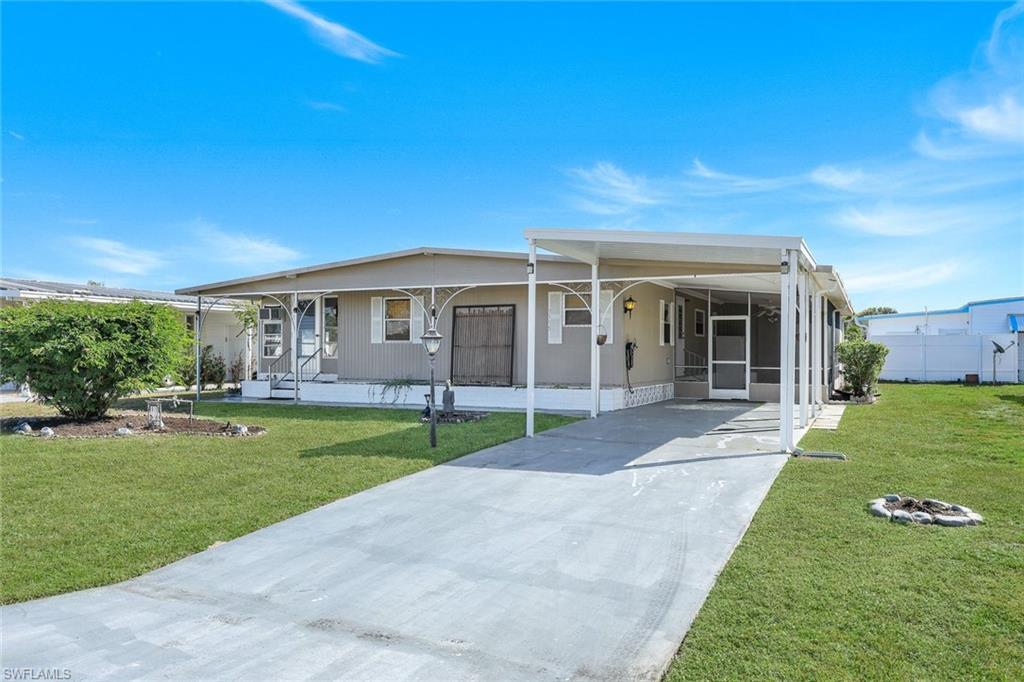 SELLER IS MOTIVATED AND WILL CONSIDER ALL OFFERS! Spacious and well-maintained 2-bedroom, 2-bath single-family home in the desirable 55+ community of Imperial Harbor where YOU OWN THE LAND. This home features a new roof, large carport area, newer A/C unit, new appliances, new electric panel, split-bedroom floor plan, lots of extra storage, and new Coretec flooring and registers throughout. The two bathrooms have also been newly renovated, and the home has been freshly painted. The master bedroom includes a large double walk-in closet. The exterior boasts nicely manicured landscaping and an existing shed for secure extra storage. NO MANDATORY HOA FEES! However, this community offers excellent amenities. If you choose to become a member and pay the one-time $1500 fee, it only costs $350/year to access the beautiful clubhouse, community pool, fitness center, billiard room, shuffleboard, pickleball, and bocce court. Imperial Harbor is centrally located within minutes of shopping and restaurants, and only a 30-minute drive to Fort Myers International Airport and about a 10-minute drive to beautiful white sandy beaches. This is your opportunity to own a slice of Florida paradise at an affordable price.