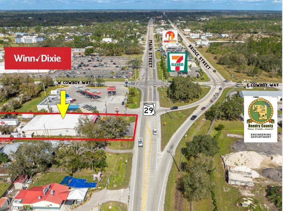 PRIME LOCATION IN BETWEEN WINN-DIXIE AND HELMS ROAD EXTENSION IN PATH OF PROGRESS! The facility consists of a 7,500 sq. ft. steel building with a 1,050 sq. ft. addition. The building boasts a new metal roof (installed in 2023) and new acrylic finished flooring. The property site is .578 acre with 100' on State Road 29 S. Front of the building features asphalt parking area and open canopied front porch for display purposes; back of building is situated on Luckey Street, providing rear access plus the current workshop and repair area including Ted's shed. Zoning is C-2, offering many commercial uses. Property is in Hendry County, but is serviced by City water. The building is open with center offices which can be easily removed or relocated and has some loft storage. PLEASE NOTE: Business is not for sale, only building and property.