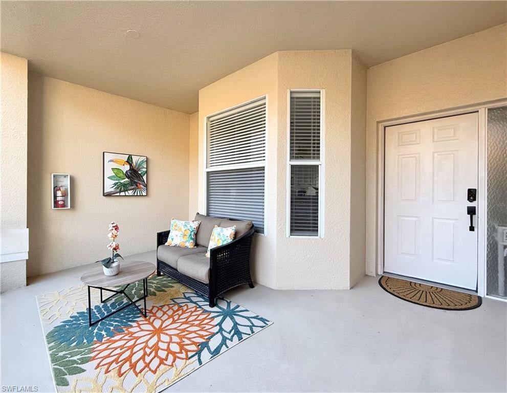 GROUND FLOOR End Unit ABBEY NOW AVAILABLE in Naples Heritage. GOLF MEMBERSHIP INCLUDED! This highly sought after 2 BR +DEN condo offers 1661 sq ft of living space, side windows for extra light, high ceilings & garage. HVAC is just a couple years old. Spacious kitchen has white cabinetry, quartz counter tops, breakfast room/eat in kitchen and double pantry. Updated white tile flooring runs throughout condo with exception bedrooms and den. Interior has been freshly painted making the entire home bright. Sliders open to back screened lanai from living room and look out over golf course, lake and preserve. While condo gets plenty of natural light, back exposure allows for owners to enjoy relaxing on back lanai without it getting too much sun. Den is located off main living room with pocket doors that can enclose room for added privacy. Den is ideal to use as office and/or 3rd bedroom when needed. Spacious primary BR. Primary bath boasts new vanity with quartz countertop, seated shower and garden tub and water closet. Guest BR is split from Primary for privacy ... has walk in closet and side window. Guest bath has new vanity with quartz countertop. Condo has walk in laundry room. Enjoy relaxing or entertaining on both front and back lanais. Naples Heritage is bundle golf community with 18 hole golf course, driving range, putting green, resort style pool w/ cabana, tennis pavilion, fitness center, pickleball courts & bocce ball. Just minutes to downtown Naples and beaches. Come live the Naples Heritage lifestyle.