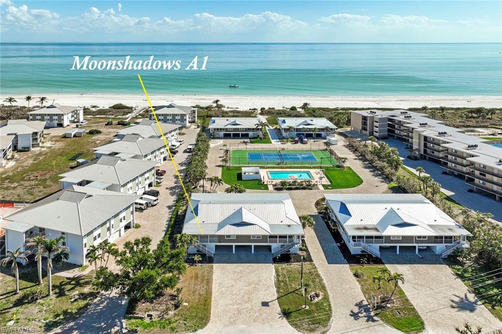 Highly Sought-After Moonshadows Unit | Only 12 Privately Owned Units | Rarely Offered. Experience island living at its finest in this beautifully renovated 3-BD, 3-BA Moonshadows home, offering breathtaking Gulf views and deeded beach access. Recently updated from top to bottom—including a new roof (July 2023), flooring, windows, and appliances—this home is move-in ready with modern comforts and timeless charm. The main living level features a spacious, open-concept kitchen, including a reverse osmosis system, flowing into the living area, with a screened and glass-enclosed front porch and a large screened and glass-enclosed lanai spanning the entire back accessible through sliding glass doors—perfect for enjoying the views year-round. The guest bedroom and bathroom on this upper level offer comfort and privacy. Beautiful flooring runs throughout the upstairs living space, complemented by tile in the kitchen, baths and lanais. The primary suite boasts an updated en-suite bathroom with double sinks, a large shower, and walk-in closet space. A winding staircase leads to the lower level, where a separate living area, guest bedroom, full bathroom, and laundry room create an ideal retreat for guests or multi-generational living. Enjoy covered parking for 2 -3 vehicles, and a lower-level beautifully landscaped paved sitting area plus a covered patio with outdoor fan. Additional features include electric shutters, a heated community pool, and tennis court access. This rare offering in Moonshadows is the perfect blend of elegance, comfort, and island lifestyle—schedule your showing today!