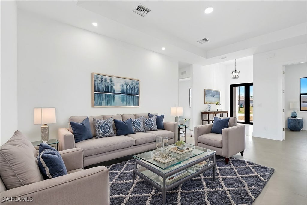 NEW CONSTRUCTION ON A CANAL! NO FLOOD ZONE! Enjoy the best of waterfront living with the perfect blend of luxury in this stunning new construction home. Featuring premium upgrades, soaring ceilings with elegant tray details, sleek tile floors throughout, high-impact windows and doors, and an abundance of natural light, this open-concept design creates a bright and spacious living area. With 3 bedrooms, a versatile den, and 2 beautifully designed bathrooms, this home offers ample space to suit your needs. The high-end bathrooms boast top-of-the-line brass fixtures and finishes, providing a spa-like retreat in the comfort of your own home. The kitchen has a large island with waterfall quartz counters, stainless steel appliances, and sleek pendant lighting - perfect for entertaining and your culinary needs. Enjoy breathtaking canal views from your backyard, offering a serene waterfront setting. The built-out laundry room includes extra cabinets for added storage and convenience. With a two car garage for your vehicles and extra storage, this home truly offers the best of both worlds—modern comfort and natural beauty right outside your door. Located just minutes from Pine Island Road, you'll have easy access to shopping, dining, and entertainment. Optional BUILDER UPGRADES ARE AVAILABLE: *Bedroom closets for $3,000* * Full lot perimeter fence and gate for $5,000* *lanai screen enclosure for $500*. Don’t miss your chance to own this exceptional home—schedule your showing today! **THIS PROPERTY QUALIFIES FOR A 1% LENDER INCENTIVE IF USING PREFERRED LENDER. INQUIRE FOR MORE DETAILS.** Photos in this listing have been virtually rendered.