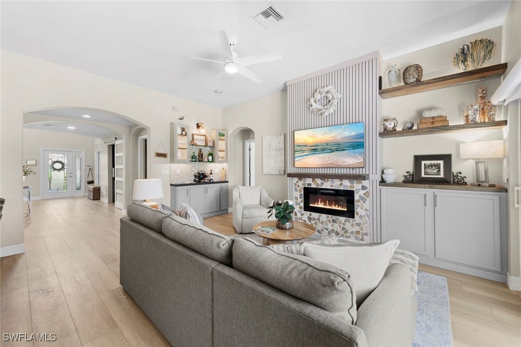 Welcome to 9063 Astonia Way in The Reserve at Estero—a newly renovated, meticulously maintained residence that lives like a model home, unlike any other in the community. This 4-bedroom, 2.5-bath home offers a thoughtful layout with a first-floor master suite, a dedicated office/hobby space, and a versatile loft, combining custom luxury with everyday functionality. Inside, you'll find a completely reimagined interior featuring IMPACT-RESISTANT WINDOWS, fresh paint, and new flooring throughout. The heart of the home is a professionally designed custom kitchen, beautifully outfitted with all-new KitchenAid appliances, sleek cabinetry, and stylish finishes, while the renovated laundry room adds function and ease with built-in storage and a second refrigerator for convenience. The custom office/hobby space provides the ideal setting for productivity or creativity, and the living area is anchored by a fireplace with a handcrafted mantle and built-in shelving, adjacent to a dry bar with custom cabinetry and backsplash—perfect for entertaining. The FIRST-FLOOR master suite is a true retreat with private access to the lanai, dual vanities, spacious closets, and a large walk-in shower. Upstairs, three generously sized bedrooms and a flexible loft area offer endless possibilities for relaxation, recreation, or additional workspace. Step outside to your private outdoor oasis featuring a covered lanai, custom outdoor kitchen with grill and refrigerator, and a sparkling saltwater pool overlooking the serene water view. The pool is heated by a BRAND-NEW natural gas Pentair Bluetooth heater, a premium system that ensures year-round enjoyment. The tranquil setting is enhanced by lush, mature landscaping and upgraded landscape lighting, creating an inviting ambiance both day and night. Additional upgrades include a WHOLE-HOUSE NATURAL GAS GENERATOR and two newer A/C units (2019), all situated in Flood Zone X. Located in The Reserve at Estero, a guarded, gated community WEST of 75 with resort-style amenities including an updated clubhouse, fitness center, tennis courts, pool, and playground. Prime location between Naples and Fort Myers, close to Coconut Point Mall, RSW Airport, FGCU, top-rated golf courses, and the beautiful Gulf beaches.