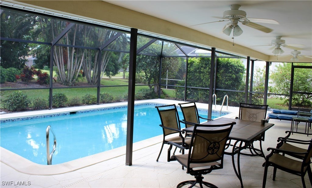 Heated POOL home with partial golf view, very private! Immaculate home is a must see offering a separate living room and family room floor plan with two pool baths. The house has pocket sliders that open this home onto its large screened in lanai and heated swimming pool. Home is being offered Turnkey Furnished. If you are a golfer and interested in Membership, some memberships offer not only golf but access to Tarpon Cove Yacht & Racquet Club and the "Endless Summer boat shuttle to Wiggins Pass State Park Beaches", Tiki Bar, Clubhouse etc. Located less than 4 miles to the Gulf of Mexico and beautiful Bonita Beach/Barefoot Beach. Dining and Shopping are also convenient with Mercato and Coconut Point close. Public golf available at Spanish Wells.