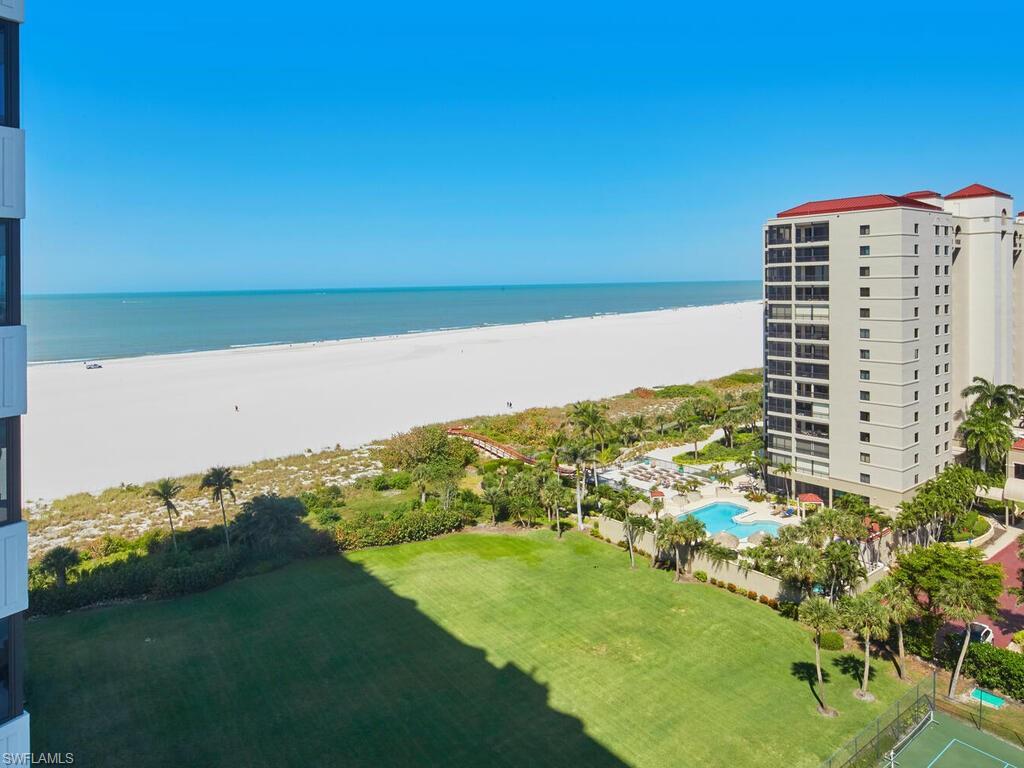 Experience the beachfront condominium living in The Gulfview Club, Unit 1210. This unit boasts a balcony that offers unobstructed views of breathtaking sunsets, the natural landscape of Tiger Tail Beach, and the Gulf of America. The contemporary design features a recently upgraded kitchen, master bath, flooring, and hurricane impact windows and sliders. The HVAC system was replaced in 2020, and the hot water heater is only 3 years old. Inside this 21-story high-rise, you'll find a newly renovated lobby and modernized elevator equipment. The exterior has been refreshed with new stucco and paint, along with a 7-year old roof and cooling towers. The expansive 7-and-a-half-acre property provides direct access to the beaches of Marco island, and Olympic-size pool, a new Tiki-style grilling area, tennis courts, and 4 new pickleball courts. The attached 5-story garage offers one covered parking space. Enjoy the convenience of low quarterly dues that include trash, water, cable, and high-speed fiber optic internet.