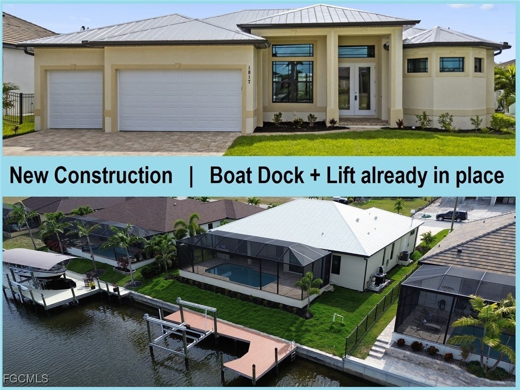 REDUCED! Come discover this stunning brand new construction home, now completed and available for immediate occupancy! This exceptional property features 3 spacious bedrooms along with a sizable den, 3 full bathrooms, and a 3-car garage. The home boasts soaring ceilings, elegant crown molding, and a grand double glass door entry. You'll be captivated by the zero edge 90-degree corner sliders that seamlessly connect the indoor living space to the expansive outdoor area and the oversized pool deck measuring 62 x 20. Additional highlights include a robust metal roof, an expansive paver stone driveway, and a salt-water pool complete with an electric heater already installed. It also already has a boat dock with composite decking and a 14,000lb boat lift in place. That’s unique on new construction as builders (and competing new construction listings) rarely include them—an added $50,000 perk to this home …and no waiting to have one constructed! The primary suite is a true retreat, generously sized with sliding glass doors leading to the pool deck, separate his and hers large closets, and an oversized linen closet. There’s also a luxurious primary bath equipped with dual vanities, a stylish soaking tub, and a double entry shower with a rain shower head. Also worth noting: the covered lanai has been roughed in for adding a custom outdoor kitchen for those evening BBQs. And the den is very tasteful designed as well- with double glass doors. You’ll also be impressed by the Chef’s kitchen showcasing 42” upper cabinets, granite countertops, and upgraded KitchenAid appliances including an induction cooktop. It also offers tasteful tile flooring throughout, an epoxy garage floor, and plenty of storage including a generous sized pantry. All closets offer quality wooden shelves too. The home is situated on the Bluefish canal, which is extra wide at about 120 feet across—a very nice additional bonus. All this in a very tasteful, quiet neighborhood that just keeps getting better! And golfers take note: The Coral Oaks public golf course is just down the street as well. Come take a look at this one right away! Some photos include virtual staging to depict what can be done with the space. **See virtual tour for a video walk-through**