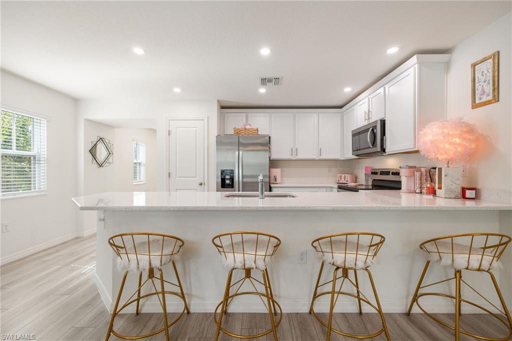 Your new home awaits with this adorable 3 bedroom, 2.5 bath townhouse located in the desirable gated community of Bayshore Commons in North Ft. Myers. This exceptional home is a true standout and designed for easy, elegant living... Built in 2023 , this premium END-UNIT offers extra privacy, peaceful views, and an abundance of natural light. The interior features stylish tile downstairs & carpet upstairs, a beautiful open concept kitchen/den area with stainless steel appliances, white shaker cabinets & quartz countertops it is absolutely a must see! Don't miss the opportunity to own this 2023 home that combines comfort, style & convenience all within a vibrant, well maintained community of Bayshore Commons