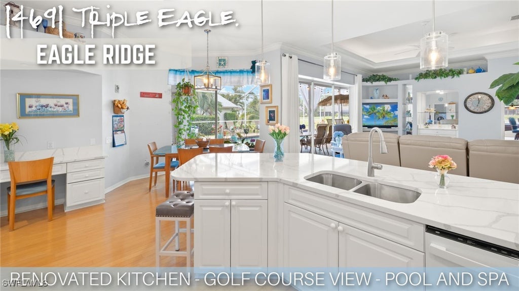 TAKE ME TO TRIPLE EAGLE! Boasting over 3,300 Square Feet with a SUPER RARE 750 SQUARE FOOT BONUS ROOM, renovated kitchen, swimming pool, spa and expansive golf course and lake view this home will have you saying, “take me to Triple Eagle”!! Well cared for and loved by the original owners, this home has a warm and welcoming feel that you will notice as soon as you walk through the door. The home is highlighted by a renovated kitchen (2025) with Quartz Countertops + backsplash, single level counter-height 6 chair breakfast bar with shiplap wall feature, new stainless-steel refrigerator/freezer, new drop pendant and recessed lighting, quartz art niche and matching quartz desk nook with extra storage! Additional features include, amazing curb appeal, super wide brick paver driveway, newer roof (2018), WHOLE HOUSE GENERATOR, soaring tall ceilings, multiple tray ceilings, Crown Moulding, lots of pocketing sliding doors opening the home to wonderful views and natural light, large living room and family room, multiple dining areas, huge master suite with 2 closets and en-suite bath, with separate tub and shower; 3 large guest bedrooms, spacious den/office, 3 FULL GUEST BATHROOMS with one that services as a pool bath and HUGE 750 SQUARE FOOT AWESOME BONUS ROOM WITH THEATRE SEATING AND BAR!! Outdoors enjoy a sparkling saltwater pool and spa, large covered lanai, screened pool cage, brick paver pool deck, expansive views of the golf course and lake AND westerly rear exposure capturing amazing SUNSETS!! Eagle Ridge is a perfectly located, low fee community in one of the nicest sections of South Fort Myers offering pay as you play golf (memberships also available), close proximity to the area’s best shopping, dining, entertainment, a 30-minute drive to the beach, 15-minute drive to the airport and so much more!! Call for your private showing today!!