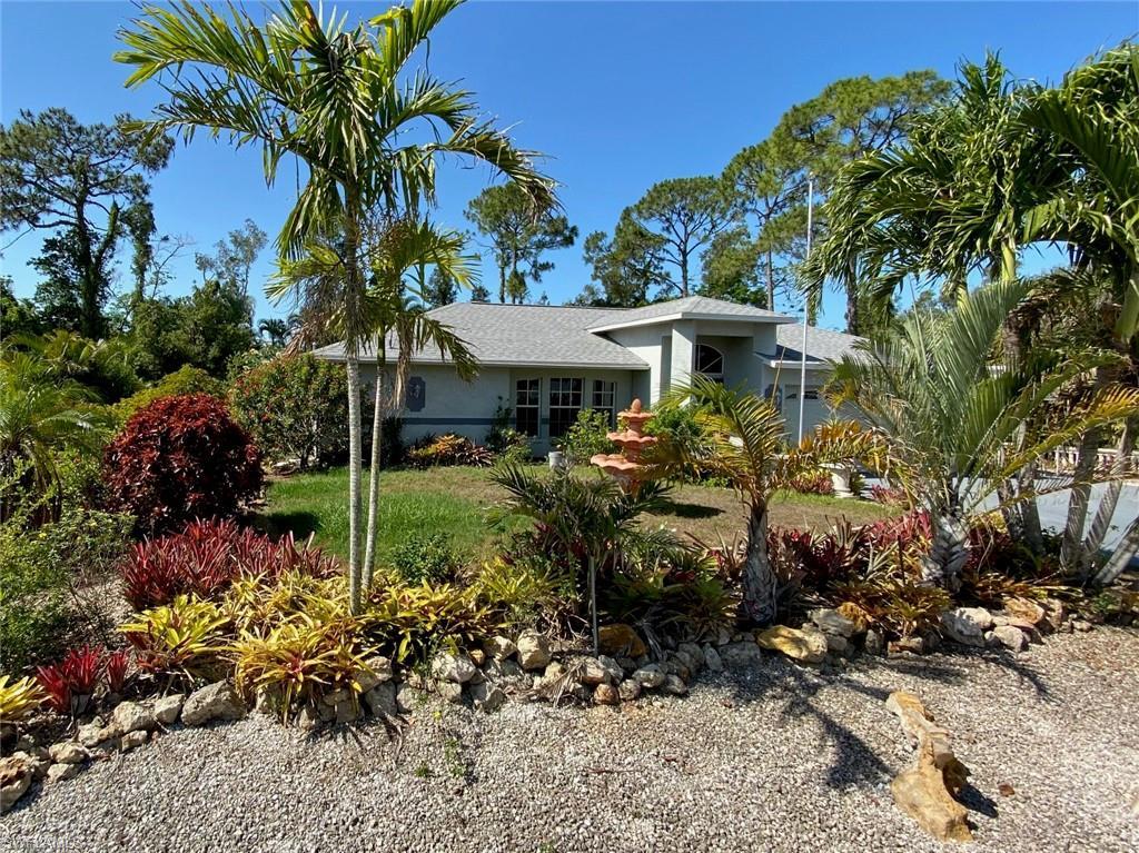 Calling all nature lovers! NOT IN A FLOOD ZONE, NEW ROOF in 2022, electric SOLAR PANELS. This well maintained 3 bedroom, 2 bath, 2 car garage home has an open split bedroom floor plan with soaring cathedral ceilings nestled on .30 acre botanical butterfly garden habitat! The home conveniently located in San Carlos Park features hardwood floors, travertine tile, ceramic plank tile and carpeting in a few select areas. The best part is the HUGE backyard that's been registered with the National Wildlife Federation as a butterfly garden and water habitat since 2007. Wind along various pathways and under arbors adorned with fragrant jasmine and other flowering vines. Butterflies and dragonflies love this space and dip down to the pond for a sip of water. It all starts with the bog pond filled with water plants for natural filtration which waterfalls to the next plant filtration level, then waterfalls again over rocks where the goldfish swim under the bridge and beneath the vibrant yellow water lilies. You will be hard pressed to see any neighbors beyond the lush tropical landscaping plus there's a 66' buffer/preserve beyond the backyard fence! Large open deck for entertaining, custom built grill with propane burner to start your charcoal for carefree grilling or gather around the firepit to tell stories after dark. Cool off in the above ground pool and watch the butterfly air traffic! Extra large driveway and apron with even more open spots out front in the gravel for all of your friends and family to park. Don't miss this rare offering!