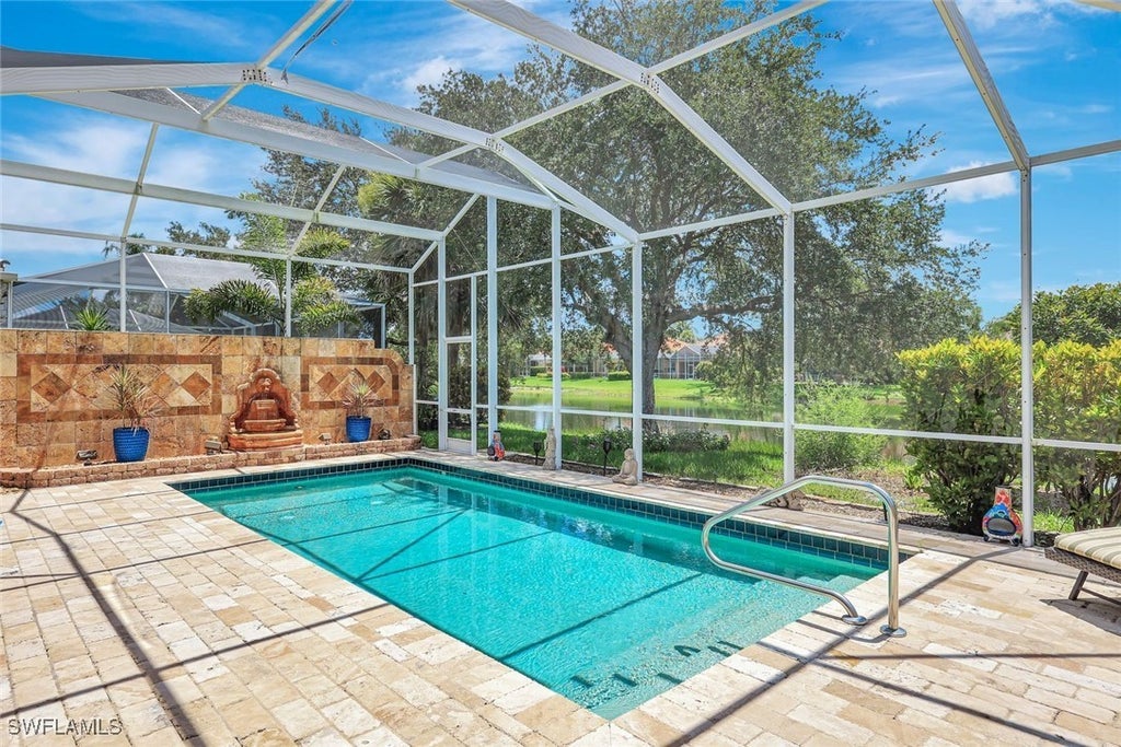 Welcome to 3008 Ellice Way, where luxurious living meets serene waterfront views. Nestled in the prestigious Island Walk community, this exceptional home offers the ultimate in Resort living. Step into an enticing foyer that sets the tone for easy living. The open floor plan boasts 3 bedrooms, a den, and 2.5 bathrooms seamlessly blending contemporary design with a casual lifestyle. Spectacular vaulted ceilings and oversized windows flood the interior with natural light, creating a warm and inviting atmosphere. The home is tiled throughout the living area. The heart of the home is a dream kitchen, with granite countertops and a spacious island perfect for entertaining. Adjacent, the dining area overlooks the pool area and water vistas, making every meal a scenic experience. Retreat to the primary suite, a sanctuary of comfort featuring an en-suite bathroom and lanai access. Each additional bedroom offers generous space ideal for family or guests. Outside, a private oasis awaits. The expansive terrazzo patio with a sparkling pool is the perfect setting for outdoor gatherings or peaceful relaxation, all while enjoying the tranquil fountain on the privacy wall. Located in one of Naples' most sought-after neighborhoods, residents enjoy access to exclusive amenities including Towncenter, Resort Pool, Lap Pool, Fitness Center, Restaurant, Gas station, Car wash, Tennis, Bocce, Pickleball, Beauty and Nail Salons. With close proximity to the renowned Naples Beaches, shopping, and dining, every convenience is within reach.
