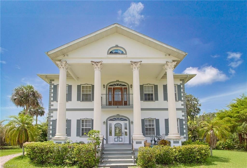 Discover timeless Southern grandeur on over an acre along the banks of the Caloosahatchee River in this stately Greek Revival masterpiece. Framed by soaring columns and graceful arches, this one-of-a-kind estate offers serene waterfront living, where mature oaks sway and breathtaking river views greet you at every turn. Step inside to a grand foyer with elegant columns and soaring ceilings, setting the tone for unforgettable gatherings. Formal living and dining spaces are filled with light, perfect for entertaining with Southern charm. The kitchen offers prep space ready to serve large family dinners or quiet morning coffees watching the river drift by. The living room and kitchen feature wide sliding glass doors that open completely to a spacious screened back porch and balcony beyond—perfect for seamless indoor-outdoor entertaining and soaking in the river breeze. An elevator connects all levels for ease and accessibility. Two convenient laundry rooms—one on each floor—make daily living effortless. Downstairs you'll also find a generous garage space ready to become your dream studio, gym, or workshop. With over 3,000 sq ft to customize, this home offers three spacious bedrooms plus a den/4th bedroom with its own walk-in closet—perfect for guests or a home office. The primary suite is a true retreat, featuring a cozy fireplace, en suite bath, and two walk-in closets for exceptional storage and luxury. Outside, imagine sipping sweet tea on your sweeping back porch, watching the sun set in spectacular color over your private, tree-lined property. Located on charming Pearl Street in historic Alva, this is Old Florida at its best—a quiet, welcoming neighborhood with space to roam, yet an easy drive to Fort Myers’ shops and restaurants. Don’t miss this rare chance to own a true riverfront estate—where history, space, and potential meet in spectacular style.