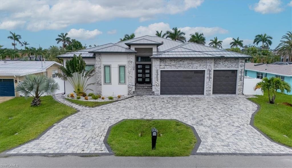 Boaters paradise in Cape Coral! Sailboat access to the gulf, walking distance to Cape Coral Yacht club and Beach. This modern house was built in 2022 and raised 1ft above flood zone elevation, house features 5bedrooms and office with separate entrance, 12foot ceilings in living room/kitchen and 10ft in bedrooms. Total of 5 full and 2 half bath, 3 car garage with insulated doors, wine room, laminate glossy cabinets with signature appliances, vaulted ceilings, tiled throughout the house. Freshly painted house has impact doors and windows,6 surveillance cameras connected via internet, integrated speaker system, 80gal commercial water heater 3 a/c units, metal roof. Outdoor kitchen has stainless steel outside grill, pine wood ceiling in lanai. Newly built seawall was 1ft elevated and added 3ft dock walkway on concrete seawall, with heated pool and spa. Location, location, location!!!