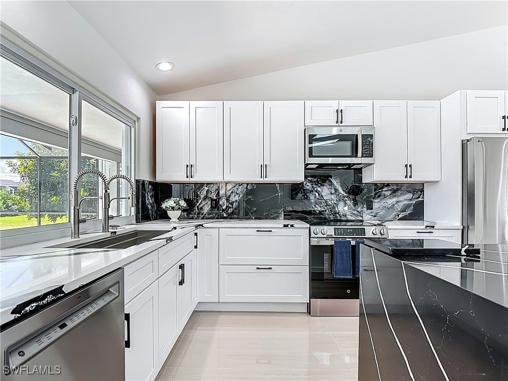One or more photo(s) was virtually staged. Located in the prestigious Forest Country Club, this fully remodeled 2,581 sq ft home offers sweeping views of the 13th hole on the Bear Course. The interior boasts large-format ceramic tile flooring and a modern, open layout. Step into the expansive great room with soaring vaulted ceilings. The gourmet kitchen is a chef's dream, featuring brand-new GE appliances, a striking quartz waterfall island, ProCraft shaker cabinetry, and a premium stainless steel Kohler dual-faucet sink complete with built-in accessories including drying racks, cutting boards, and washing bowls. The oversized master suite includes a private den-ideal for a home office, gym, or reading nook-along with two spacious walk-in closets. The luxurious en-suite bathroom offers quartz countertops, dual sinks, a huge shower with dual shower heads, a separate soaking tub, and an upgraded Eplo bidet toilet. Guest bathrooms are appointed with custom built-in shelving, adding elegance and functionality. New washer and dryer in the tailored laundry room. Enjoy outdoor living with a refinished PebbleTec pool. A two car garage and long driveway provides ample parking for guests and family. A separate club membership is available, granting access to two championship golf courses, a tennis club, pickleball, bocce, and a vibrant social club featuring a luxurious clubhouse with fine dining. Incentives are available for new members through December 2025. Located near RSW Airport, FGCU, Gulf Coast Town Center, Coconut Point Mall, and just 20 minutes from Fort Myers Beach-this home offers the perfect blend of luxury, leisure, and convenience.