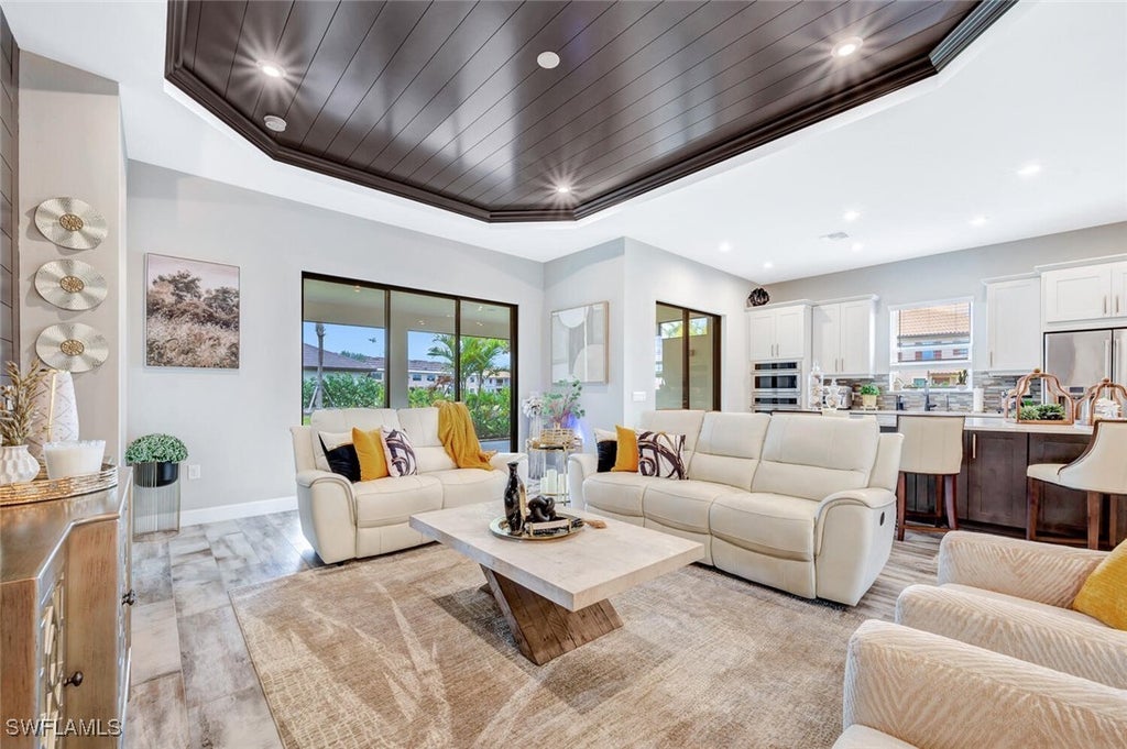 Experience unparalleled luxury in this immaculate, newly constructed residence, completed in 2022. Nestled in the prestigious Esplanade by the Islands community, this Lazio model home is replete with opulent upgrades designed to elevate your lifestyle. This exquisite property features three bedrooms, three bathrooms, and a versatile den, embodying the epitome of Florida's ultra-luxurious living. At the heart of this splendid home are a chef’s dream kitchen equipped with top-of-the-line stainless steel appliances, including a six-burner gas cooktop and a built-in oven/microwave. The kitchen is adorned with upgraded cabinetry, sleek quartz countertops, sophisticated designer lighting, and a stylish backsplash. Additional cabinetry beneath the expansive island enhances functionality and style. The thoughtful floor plan boasts wood-look tile flooring throughout and is accentuated by designer lighting fixtures. The great room, enhanced with newly installed shiplap, leads to an expansive lanai surrounded by lush landscaping, pre-wired for a future pool and outdoor kitchen—ideal for seamless indoor-outdoor living. Oversized, light-filled bedrooms offer a serene retreat for guests, complete with access to the numerous amenities that Esplanade has to offer. The bathrooms are a masterpiece of design, featuring exquisite vanities, premium quartz and granite countertops, and designer tile work. The luxurious primary suite is a sanctuary in itself, highlighted by a charming bay window and an expansive en-suite bathroom. This spa-like bath includes a vast walk-in shower, a lavish vanity with a makeup area, designer tile, and a spacious walk-in closet. A beautifully appointed and efficient laundry room with upgraded cabinetry and new appliances adds to the home’s conveniences. Residents of Esplanade by the Islands enjoy access to exceptional amenities, including tennis and pickleball courts, a comprehensive fitness center, eight miles of scenic walking trails, upscale dining options, and a magnificent pool and spa area. Drawing inspiration from its sister community, Esplanade Golf on Immokalee Road, it offers an idyllic setting close to Marco Island and Old Naples—putting the best of Southwest Florida right at your doorstep.