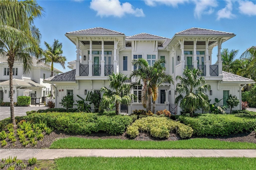Discover tranquil lake and lush palm views from this beautifully furnished, light and bright Magnolia floorplan residence, quality built in 2020 by Gulf Bay Homes in the exclusive village of Dorado at Fiddler’s Creek. With eastern exposure for gorgeous sunrises and a design that lives like a single-family home, this second-floor retreat offers three bedrooms plus a den, three-and-a-half baths, and a spacious two-car garage. The popular layout blends sophistication and comfort, enhanced by soaring volume ceilings, dramatic architectural details, and seamless indoor-outdoor living. A wood staircase with stainless accent rods leads to the impressive main living area, where 35” x 11” porcelain tile floors, recessed LED lighting, and custom ceilings set the tone. The great room exceeds expectations with a vaulted ceiling featuring shiplap and coffered accents, ceiling speakers, and water views through sliding doors with remote-controlled electric shades. The adjacent dining area includes a built-in dry bar with cabinetry and counter space, perfect for entertaining. The chef’s kitchen boasts white cabinetry with glass-front uppers, in-cabinet and under-cabinet lighting, quartz counters, and a glass-tile backsplash. A full suite of Bosch stainless appliances includes a French-door refrigerator with freezer drawer, wall microwave, natural gas cooktop with hood vent, wall oven with convection, and dishwasher. An island with pendant lighting and bar seating, plus a pantry, completes the space, which flows effortlessly into the living and dining areas. The owner’s suite is a serene retreat with coffered ceilings, stunning water views, and a spa-like en-suite bath offering dual quartz vanities with makeup counter, a frameless walk-in shower with bench, and an expansive walk-in closet with custom wood shelving. Two guest bedrooms each feature ensuite baths, one with French doors leading to a private tiled balcony. The den, accented with tray ceilings and crown molding, provides the ideal setting for a home office or study. Additional highlights include a powder bath, a well-appointed laundry room with quartz counters, and a two-car garage with epoxy flooring and a 240V outlet for EV charger. The screened lanai offers covered outdoor living with tile flooring, a tray ceiling with wood plank, ceiling fans, and recessed LED lighting, all overlooking tranquil lake views. With impact glass windows and doors throughout, this home combines elegance with peace of mind. Residents enjoy world-class amenities including a resort-style pool, spa services, fitness center with classes, tennis and pickleball program with TEN new pickleball courts, bocce, an extensive activity calendar, and casual and fine dining. Miles of sidewalks wind through the lushly landscaped community for walking, bicycling, and running, while optional immediate memberships for golf, beach, and marina elevate the SWFL lifestyle-including a recently renovated golf course and brand-new golf clubhouse.
