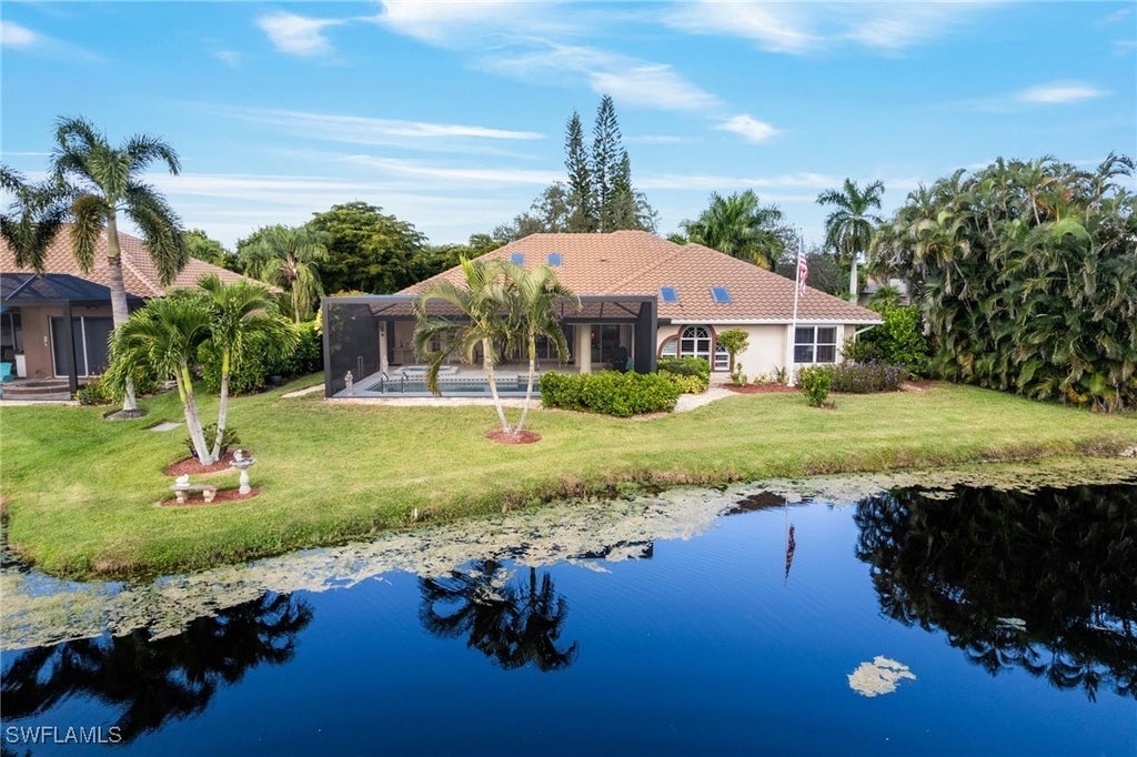 Excellent Floor plan with a Central Kitchen surrounded by a Large Family Room, Formal Living Room, Dining Room, Breakfast Nook, and easy access to a Large 689 sq ft. Covered Lanai for both Indoor and Outdoor Entertaining. This 3 bedroom, 2 bath, Pool Home is located on a Prime Lot offering Privacy and Southeast Views of the Lake and Golf course. The Vaulted Ceilings and Skylights, along with multiple sliders provides an abundance of natural lighting, and the split floor plan offers ideal privacy for guests. For increased safety and security, this house in located in an X-500 Flood Zone where Flood Insurance is Not Required. A New Tile Roof and large Picture Window Screen Enclosure were installed in 2023. Current Homeowners insurance is below $5,000 per year. The 600 sq ft garage has ample room for two passenger vehicles and a golf cart. Spanish Wells Country Club (membership is optional) offers a 27-hole golf course, tennis, fitness, bocce, and a variety of activities. This is an Ideal Location where community amenities, and ease of access to Barefoot Beach, Bonita Beach, RSW airport, Fine and Casual Dining, Coconut Point Mall, Mercato and Waterside Shops makes Living in SWFL a dream of a lifetime. Come see your little piece of paradise for yourself.
